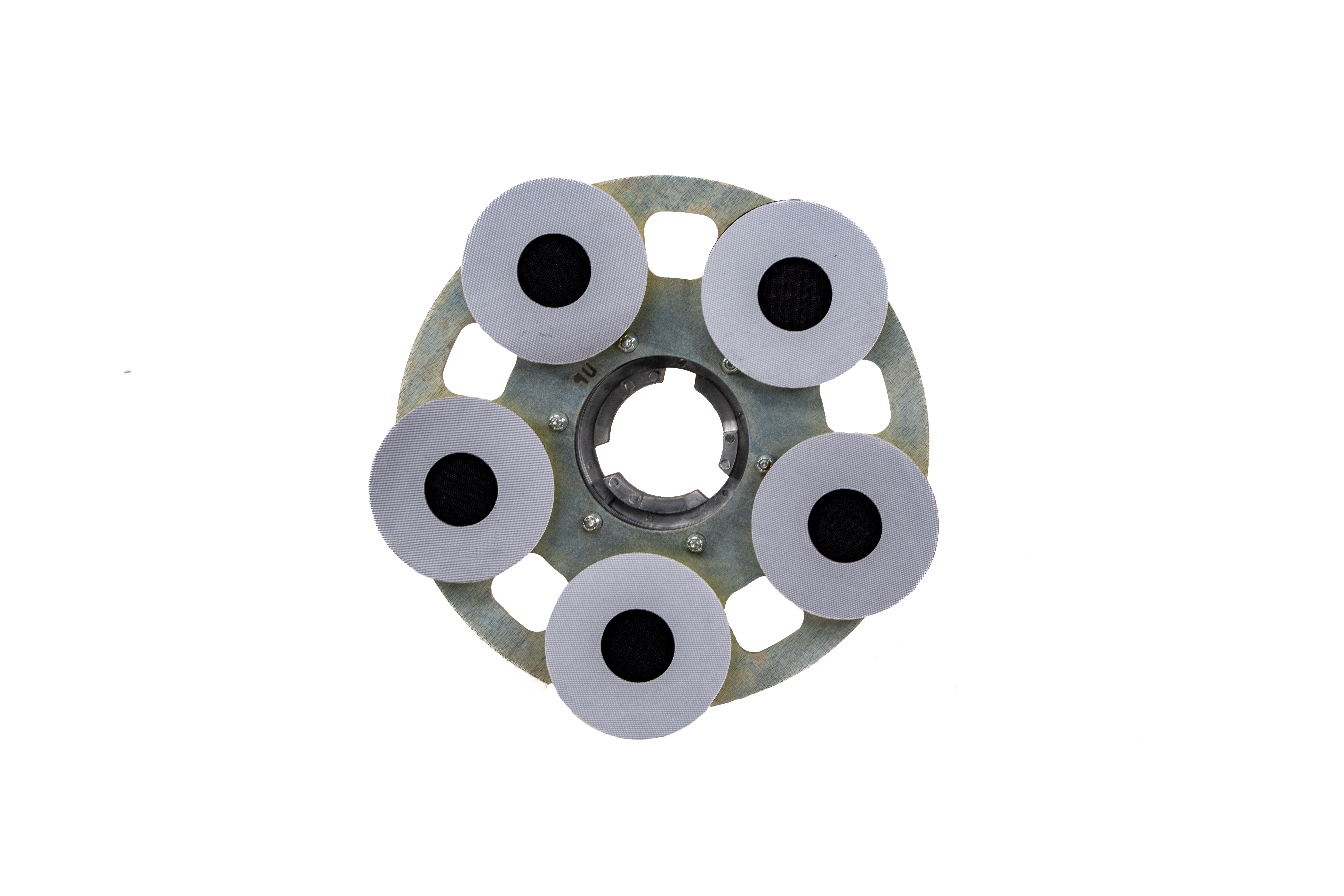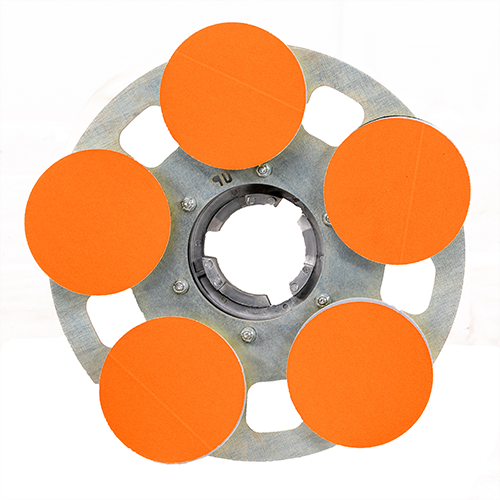 The NEW HydraSand 5 attachment mounts to any rotary sander and utilizes five 5” pads mounted to a thick steel plate.